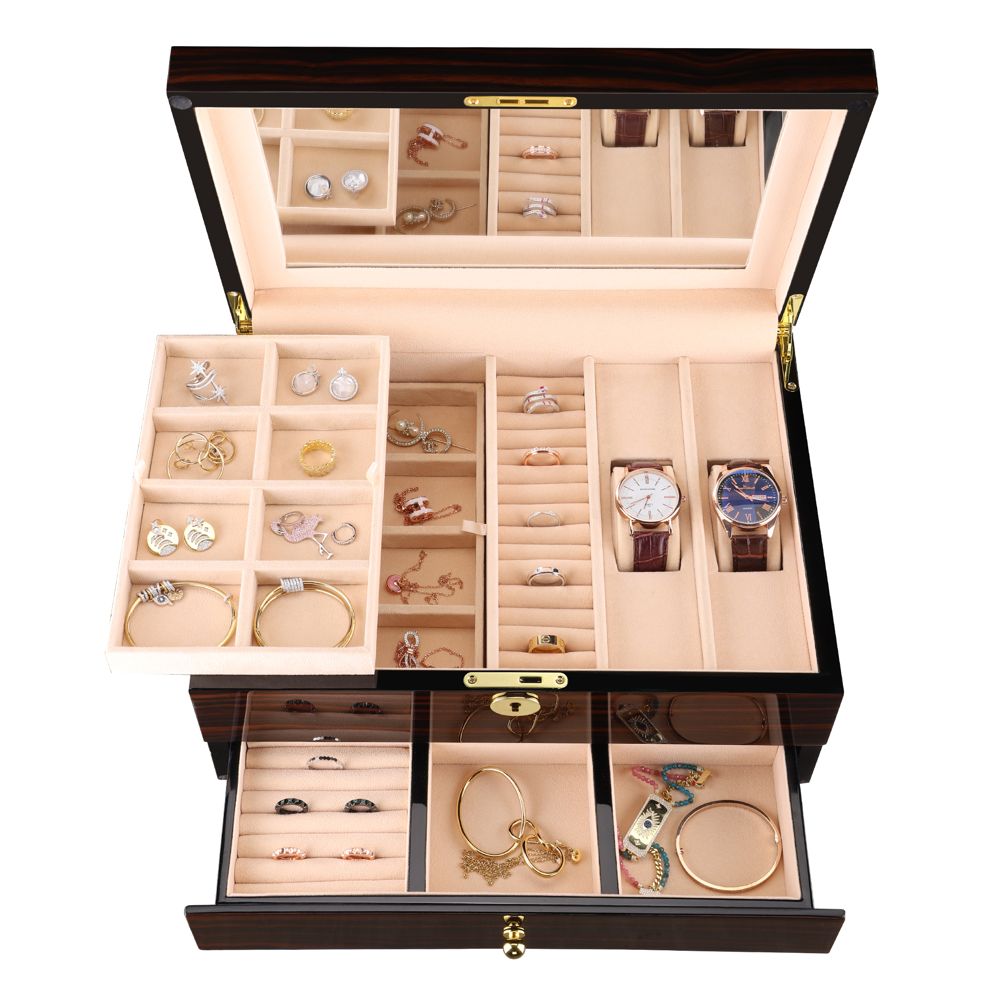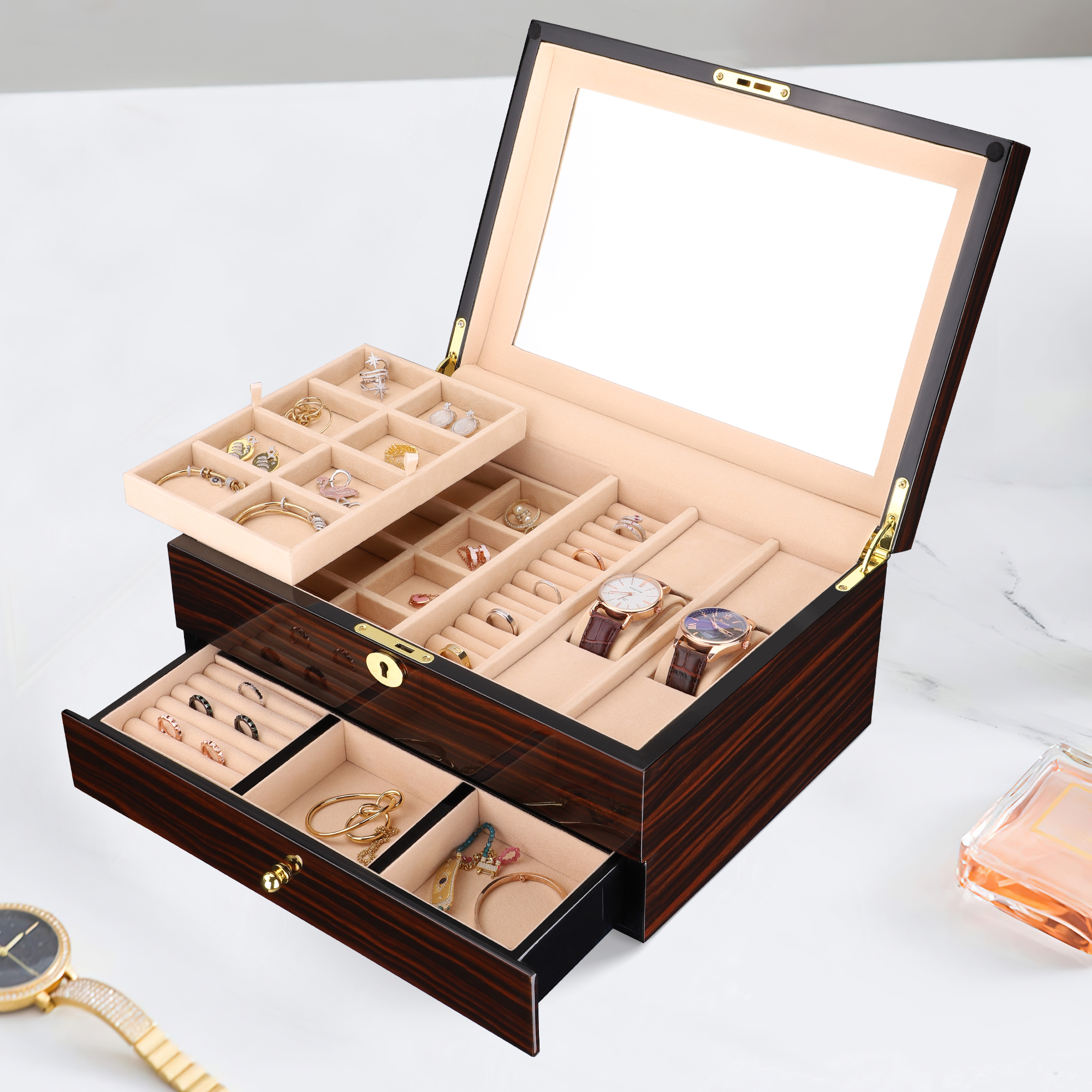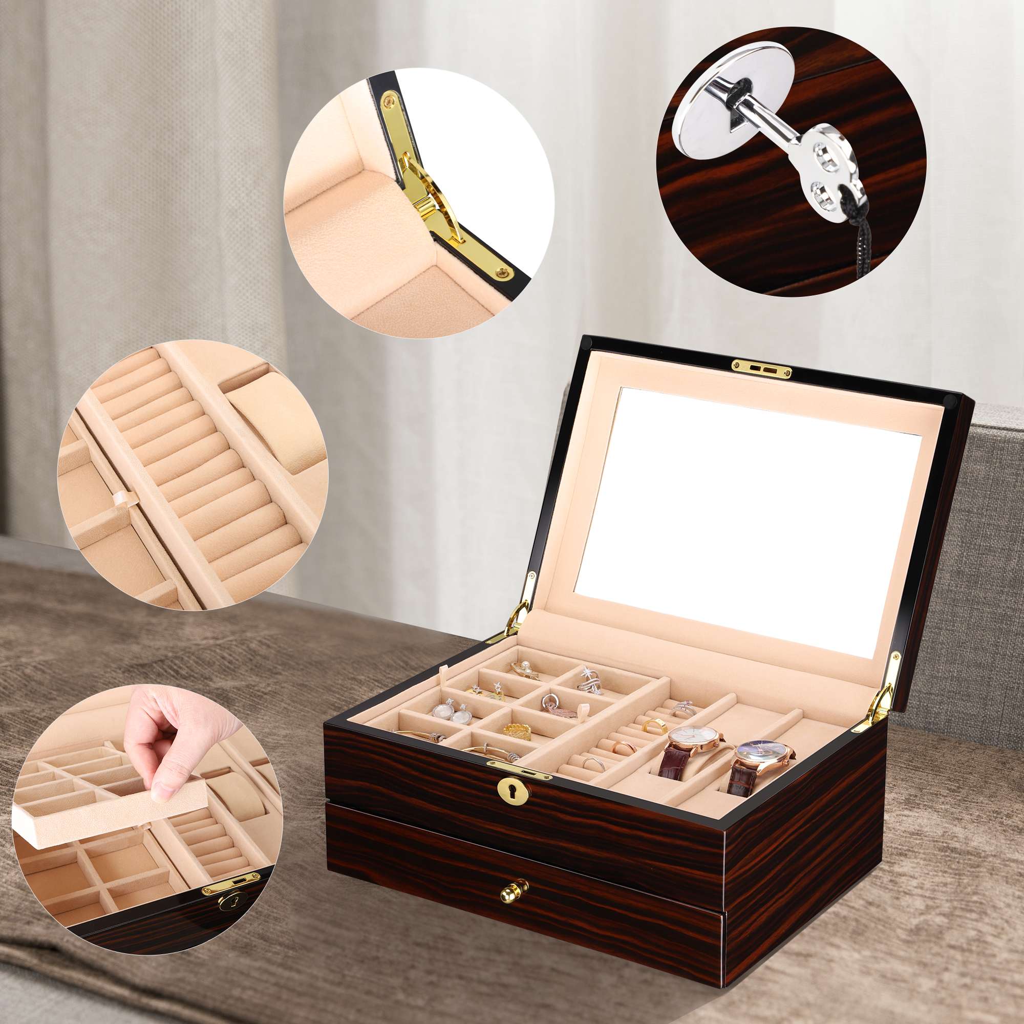 • Organized and Secure Interior: The interior is lined with a soft, protective fabric and includes dedicated compartments ideal for organizing rings, studs, and delicate bracelets or pendants. This design ensures that every piece stays separate, tangle-free, and safe from scratches.