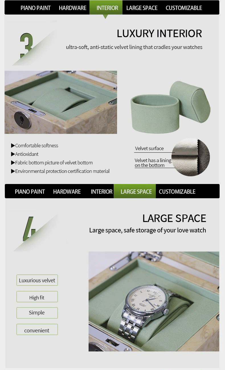 - Interior Lining: High-density velvet fabric. The velvet is soft and delicate, providing excellent shock absorption and scratch resistance to effectively protect the surfaces of watches and jewelry.