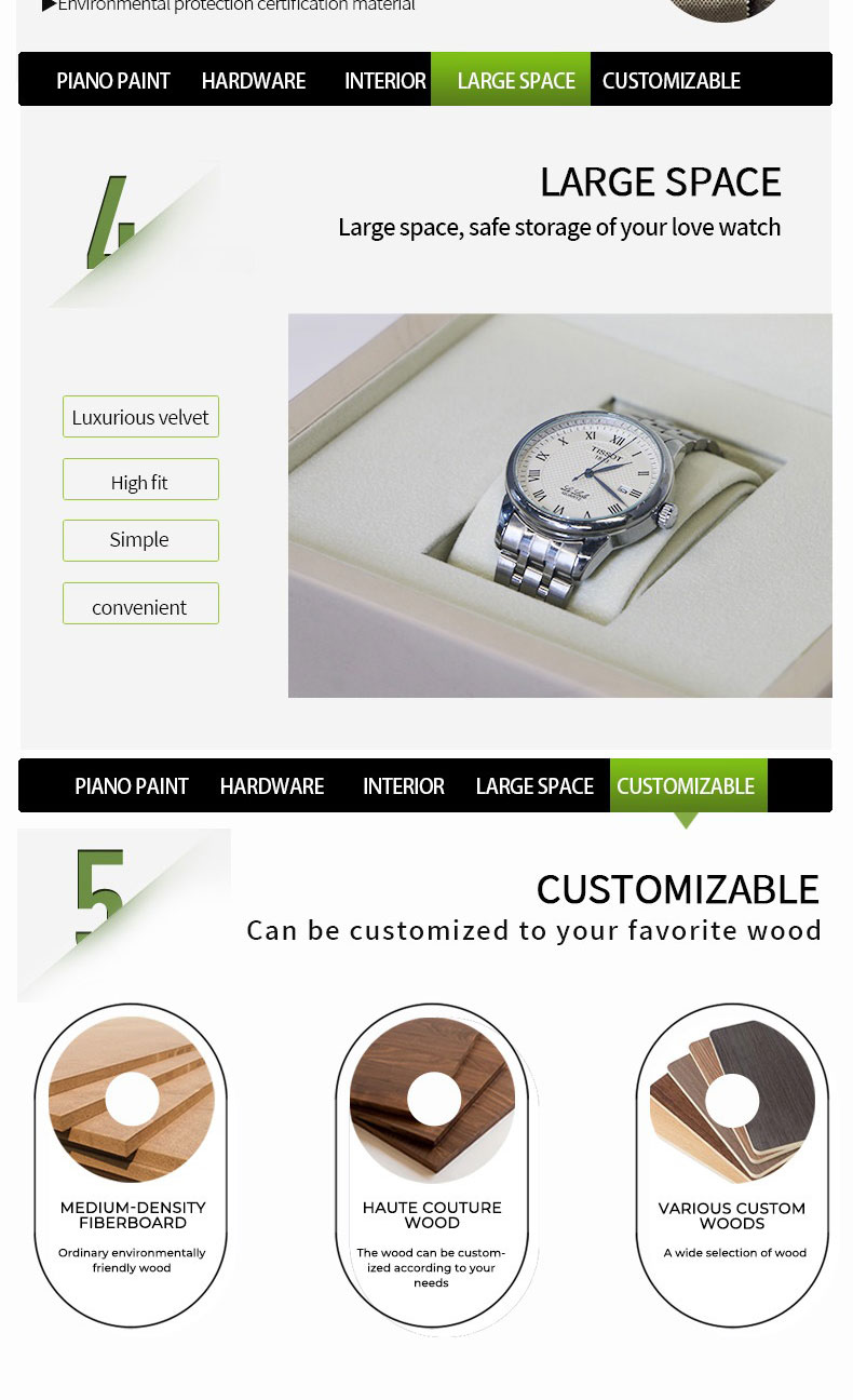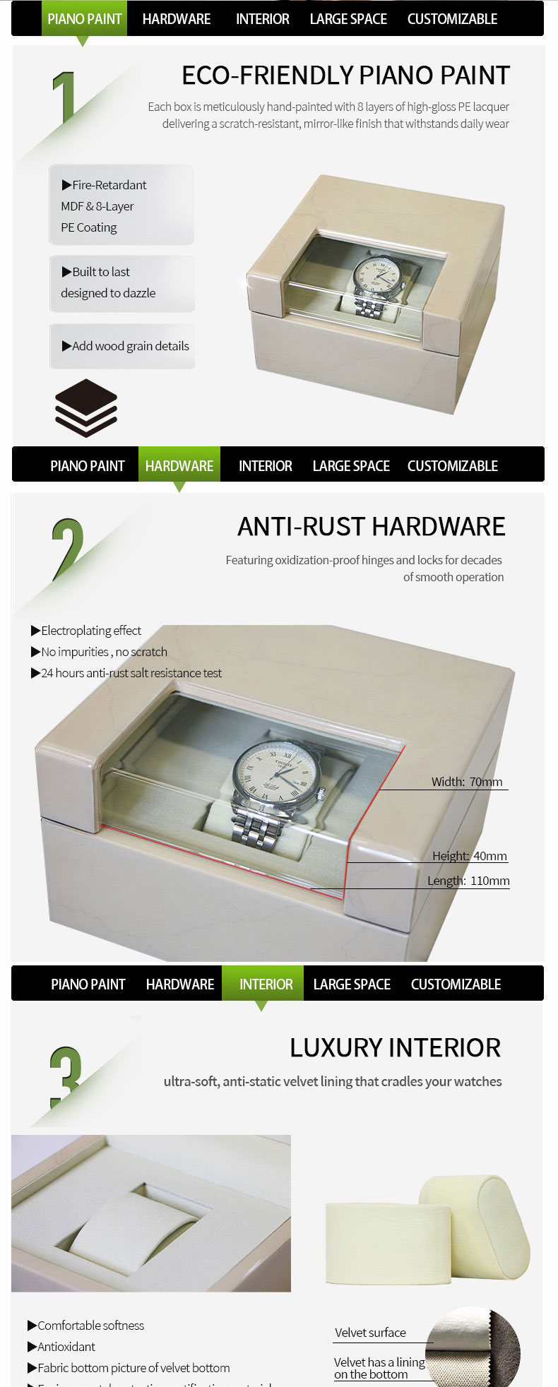 - Interior Lining: Lined with soft, high-density velvet fabric, the interior is designed with watch protection as a core priority. The non-abrasive texture of the plush velvet prevents scratches and scuffs on watch surfaces, ensuring every timepiece remains in immaculate condition.
