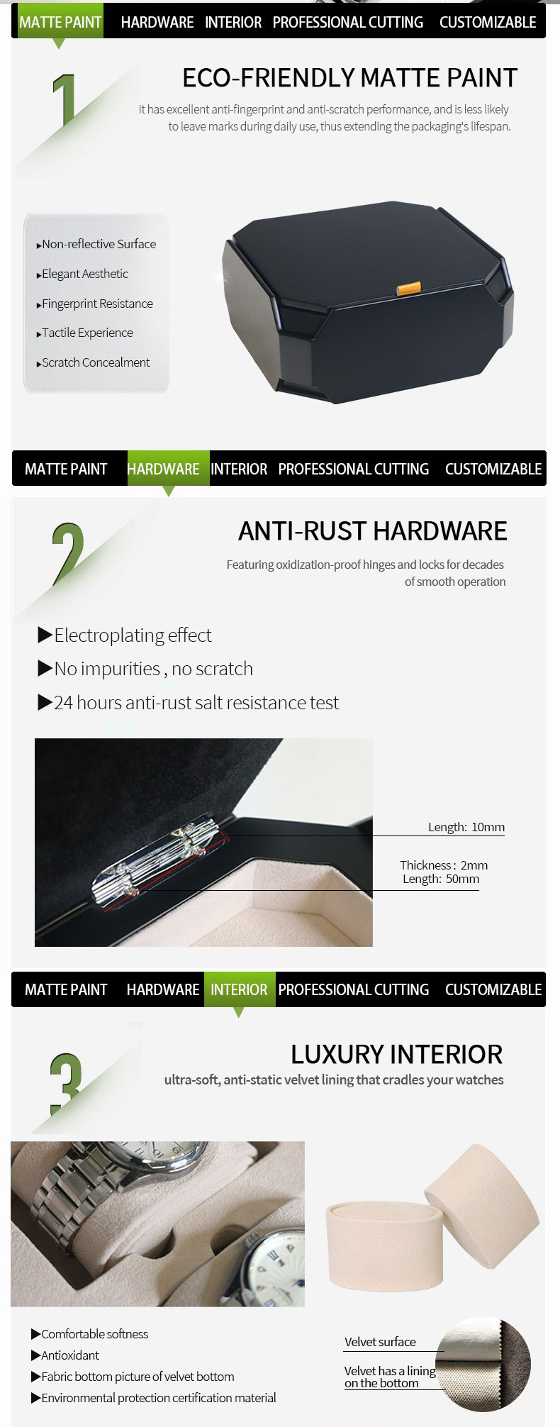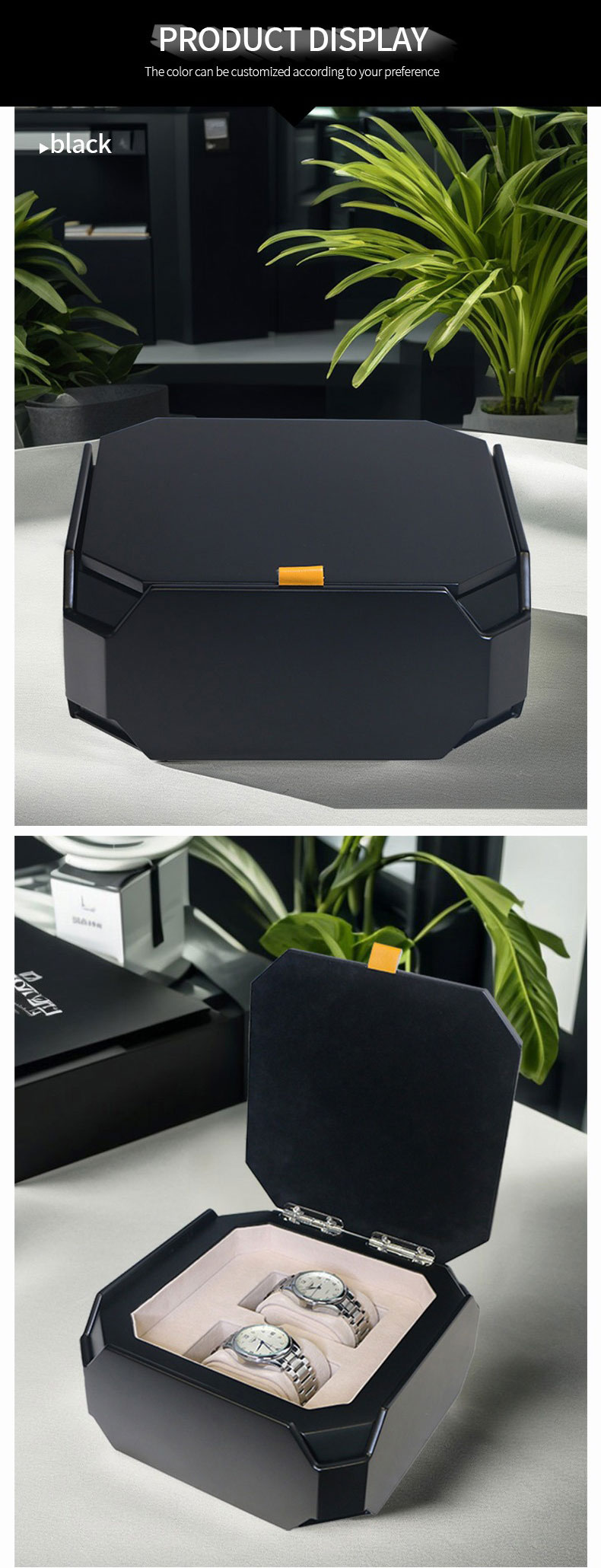 - Premium Materials: The exterior is covered in a durable, scratch-resistant black material, giving it a sleek, matte finish. A subtle yet striking yellow accent button on the front adds a touch of personality and makes it easy to open. The interior is lined with a soft, protective fabric that cradles your watches.