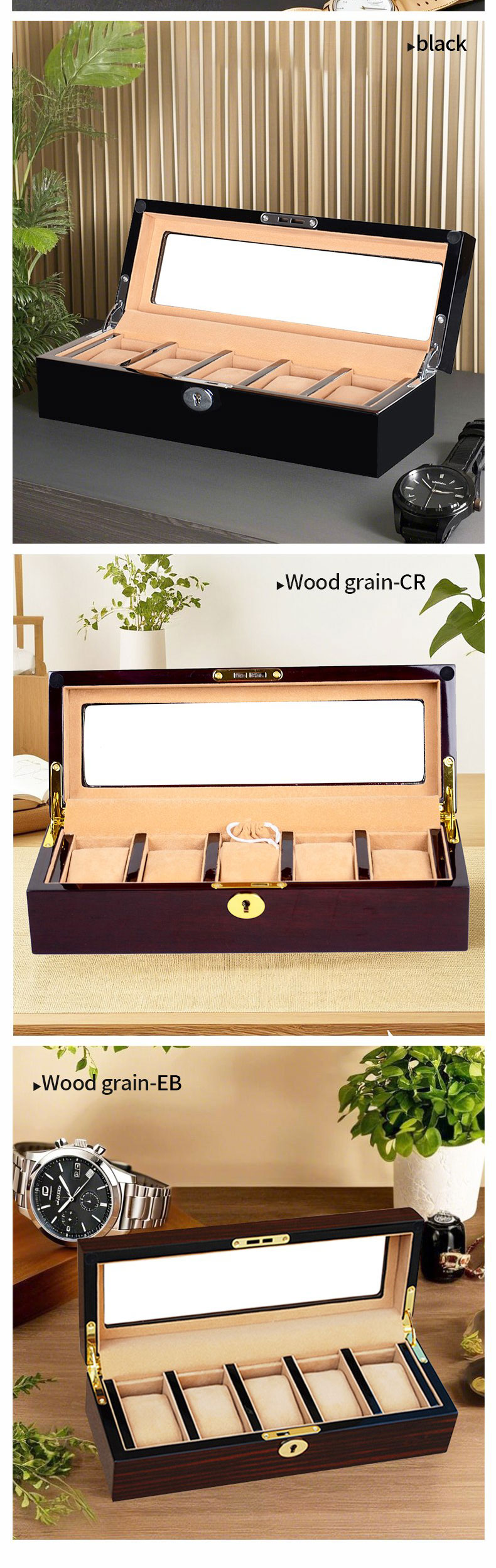 - Rich, Warm Wood Finish: This watch box features a stunning natural wood grain exterior that exudes classic warmth and sophistication. The rich, textured finish gives it a timeless appeal, making it a perfect addition to any study, office, or bedroom.