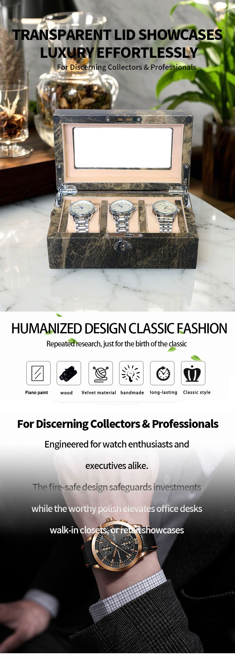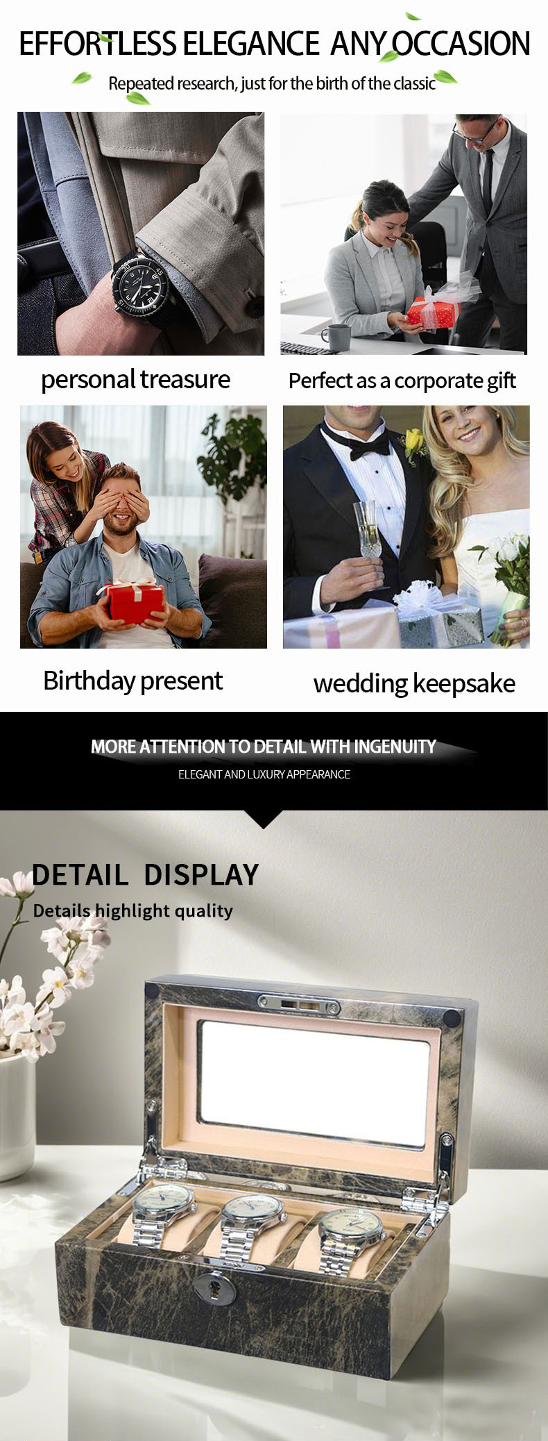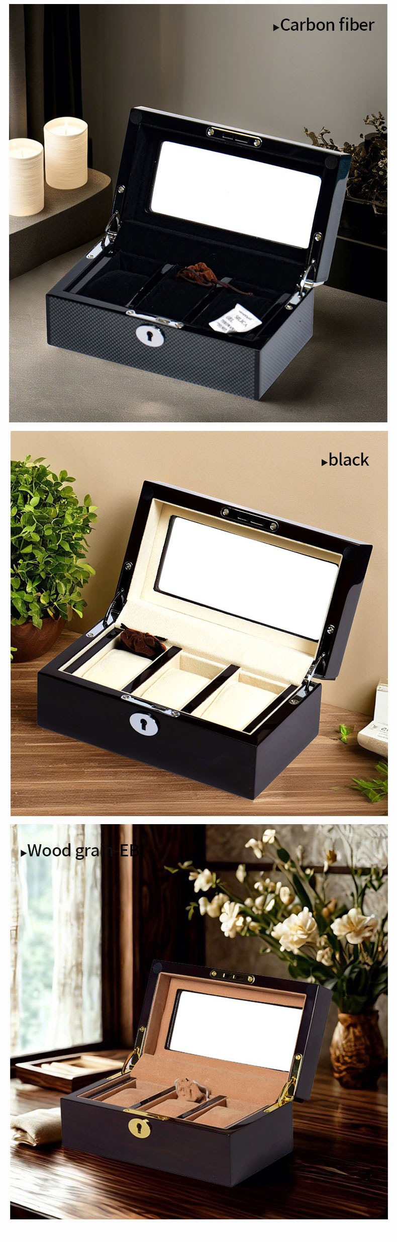 - Smart Organization: Designed to hold up to 3 watches, the box includes individual compartments and soft cushions. This thoughtful layout ensures each timepiece is held securely and separately, preventing contact and keeping your collection perfectly organized.
