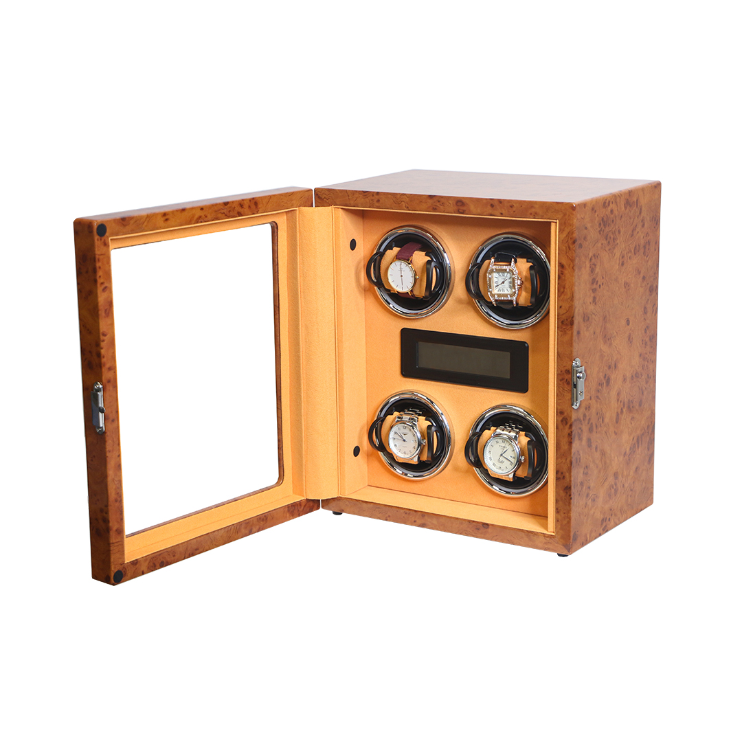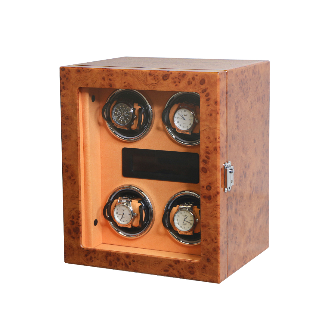 The winder features a high-quality wood box with a multi-layered piano lacquer finish and a clear acrylic window, allowing you to showcase your timepieces. It is equipped with a Japanese Mabuchi silent motor, ensuring virtually no operational noise.