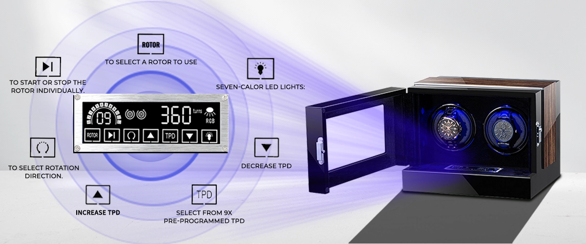 The new touch screen system provides a simple and precise way to manage your watch collection with a one-click start function for all rotors.