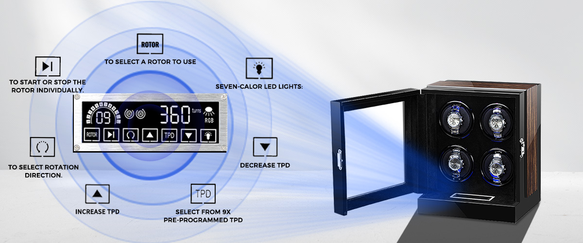 The new touch screen system provides a simple and precise way to manage your watch collection with a one-click start function for all rotors.