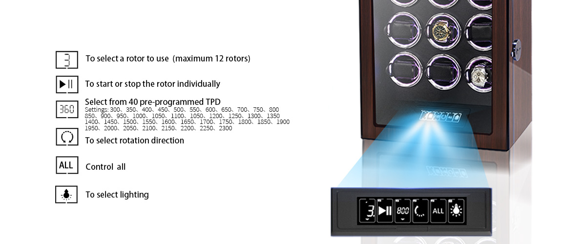 This new system offers one-click start-up for all rotors. The intuitive touch screen control allows you to set the exact number of Turns Per Day (TPD) for your watches, from 360 to 2180, and customize the rotation direction.