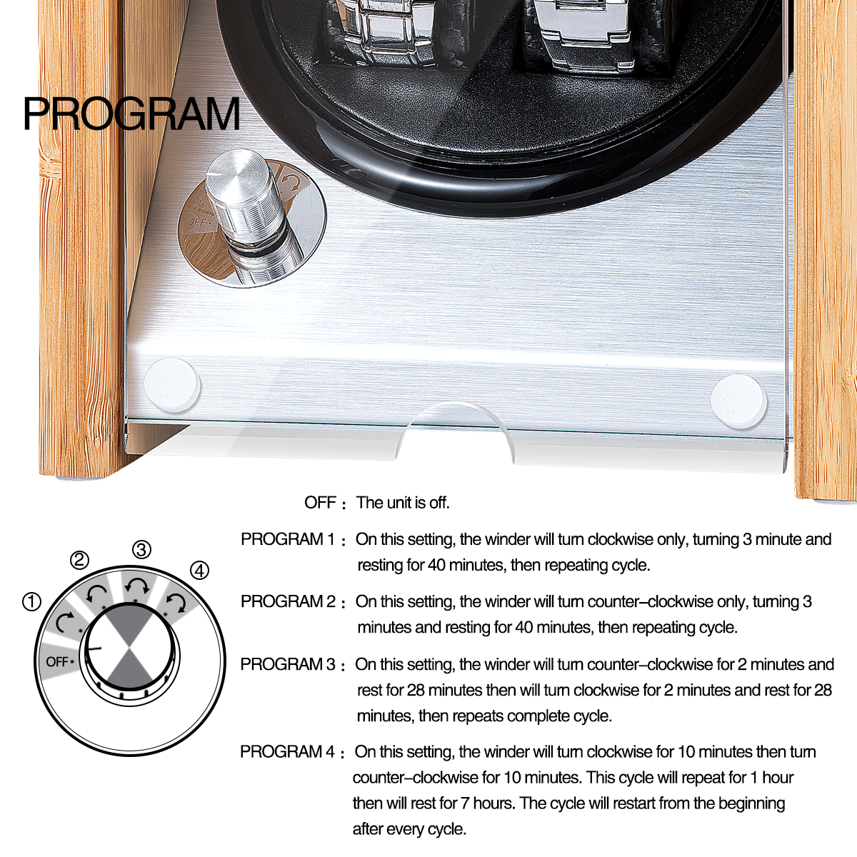 The winder offers a variety of winding programs, easily selected with a knob switch on the back. This allows you to choose the perfect setting for your watch’s specific needs.