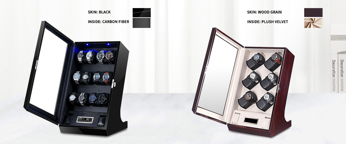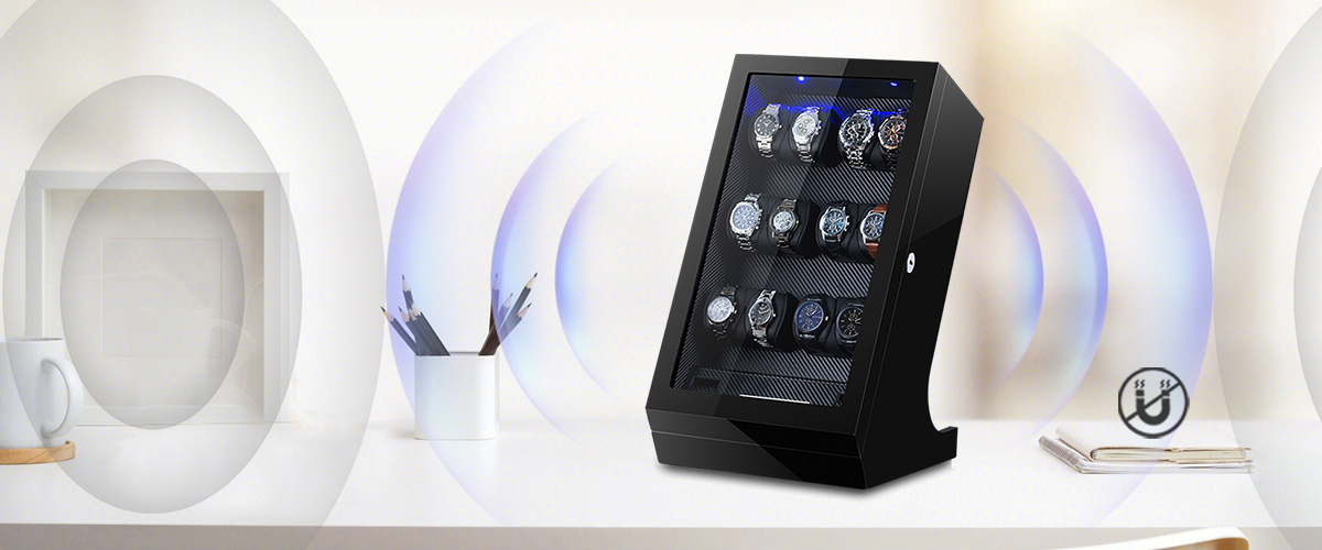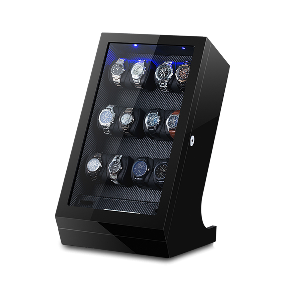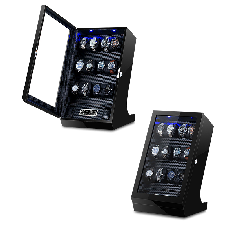 This is a  Twelve-rotor watch winder with a sleek and modern design. It features a high-gloss finish on its wooden exterior and a clear acrylic window. This winder is powered by a Japanese Mabuchi motor, ensuring a quiet and smooth operation. The interior is lined with soft velvet to protect your timepieces from scratches.