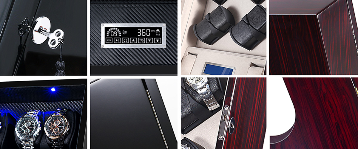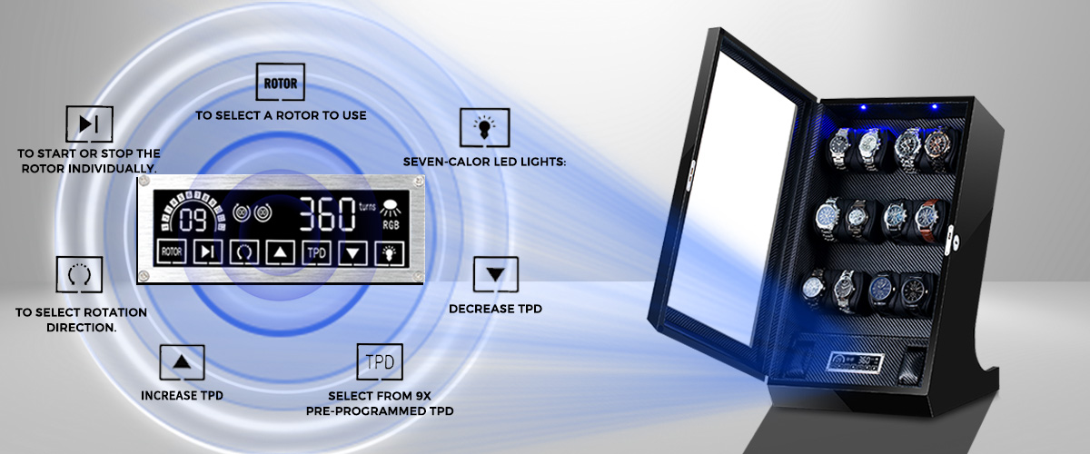 A key feature of this winder is its new touch screen control system, which allows you to easily manage the winding process for each of your watches. The unit also includes a seven-color LED ambient lighting system, letting you customize the display to match your style or mood.