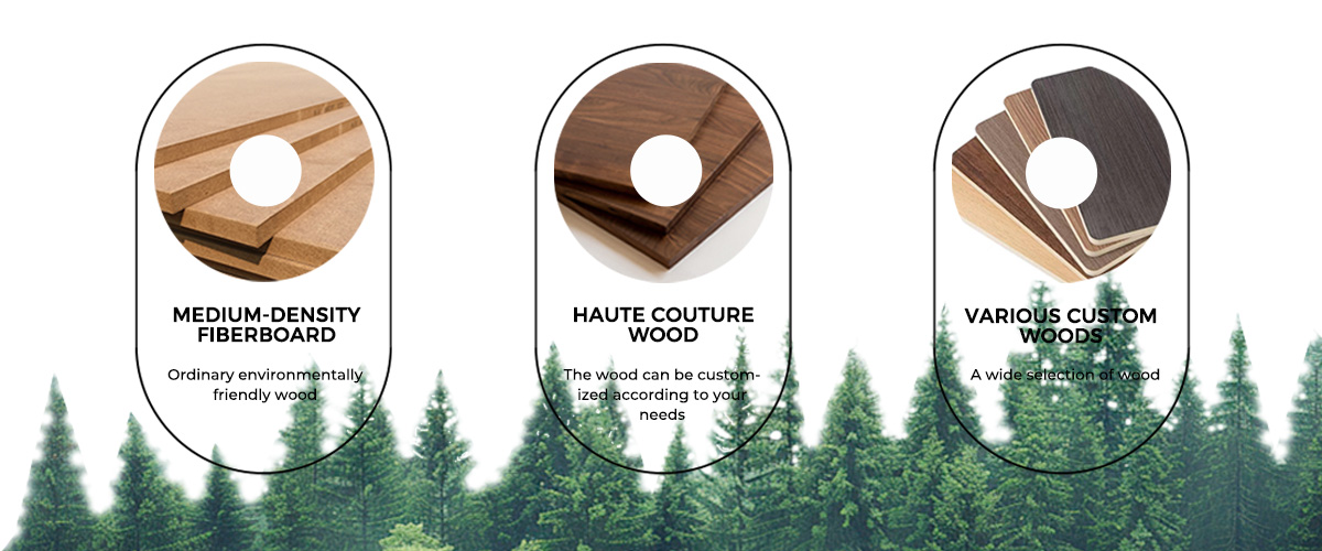 • Custom Woods: A wide selection of custom woods is available to match your specific needs, including Medium-Density Fiberboard and various Haute Couture Woods.